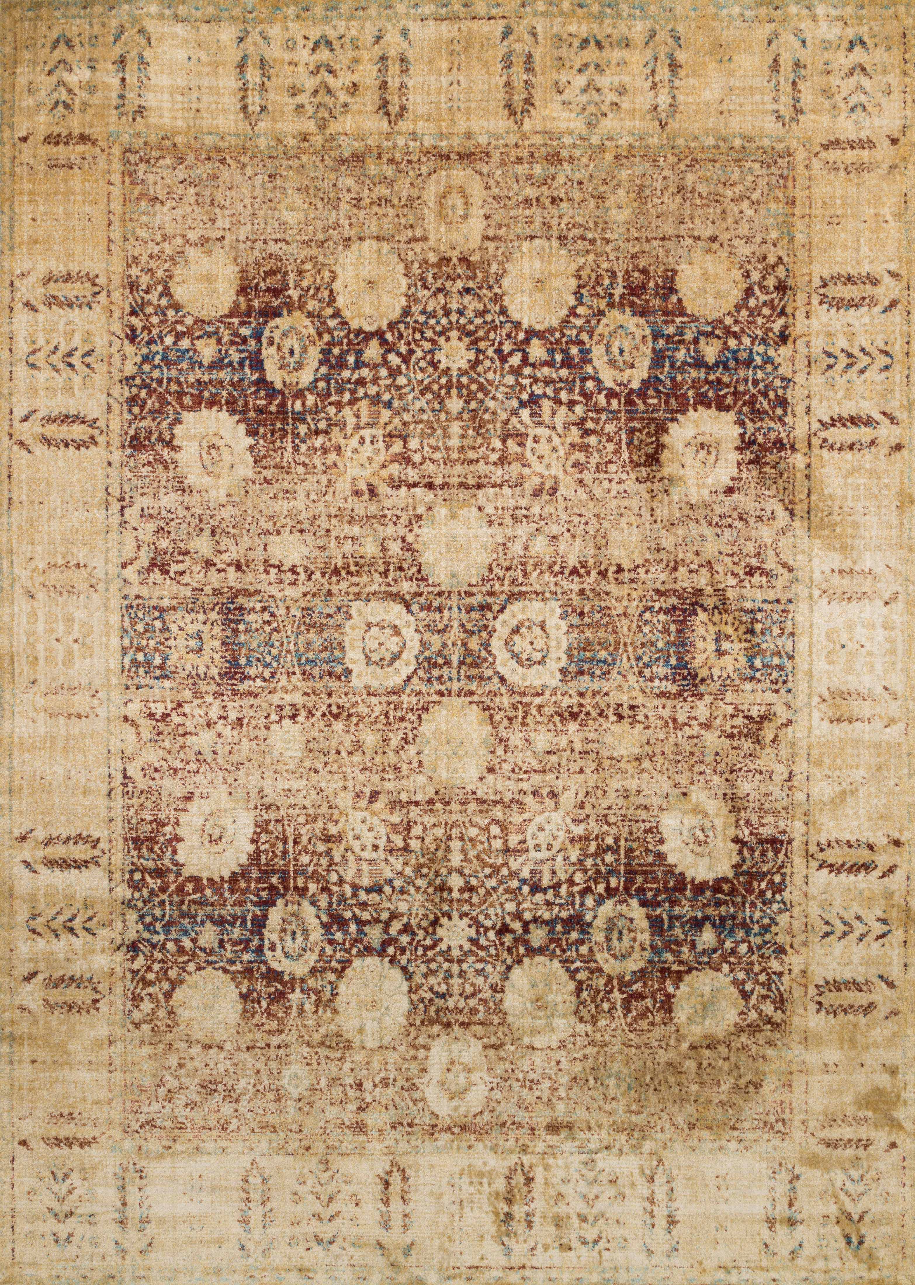 Ornate traditionals distressed and full of character are modernized by illuminating color-ways in this collection