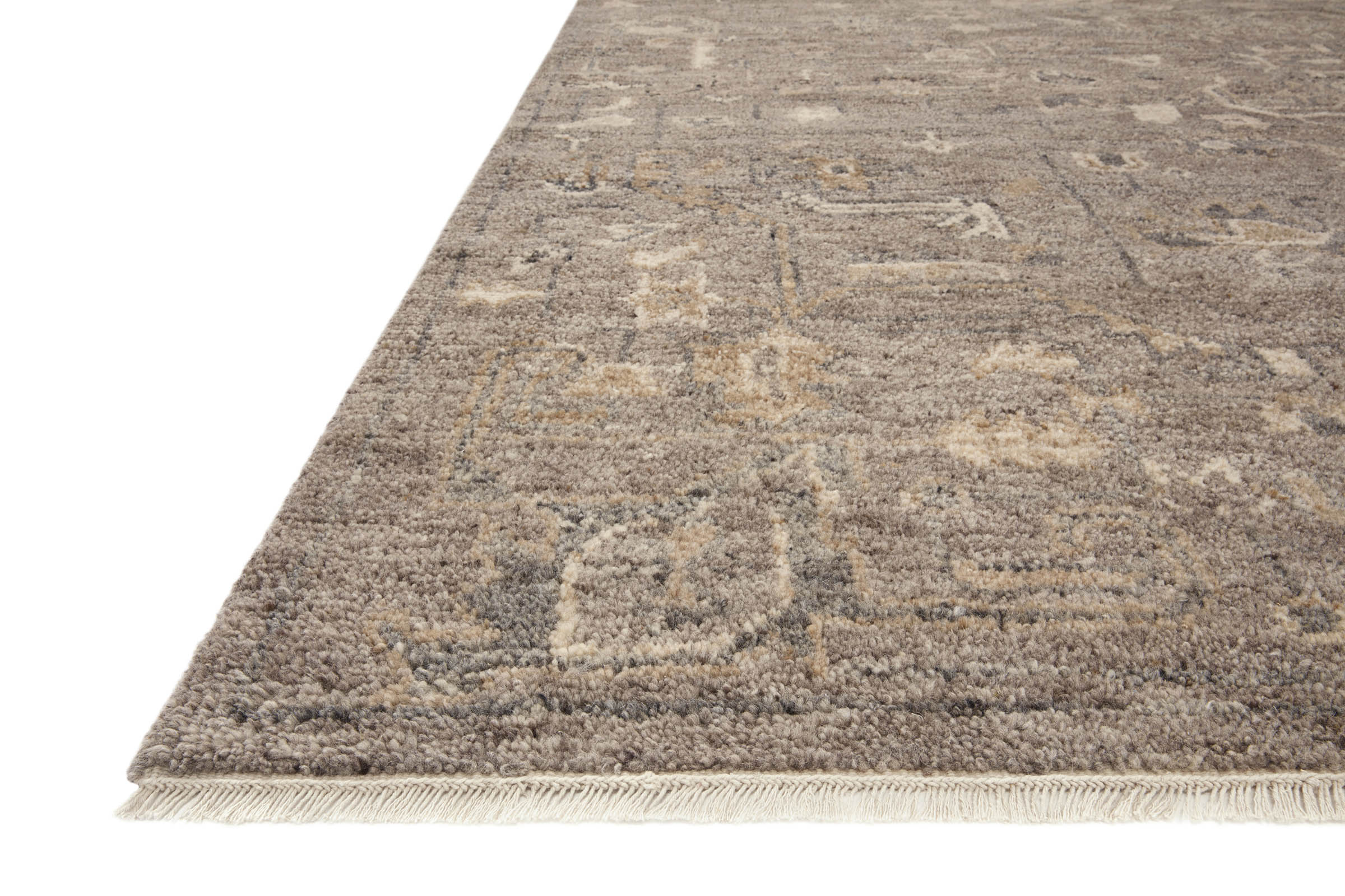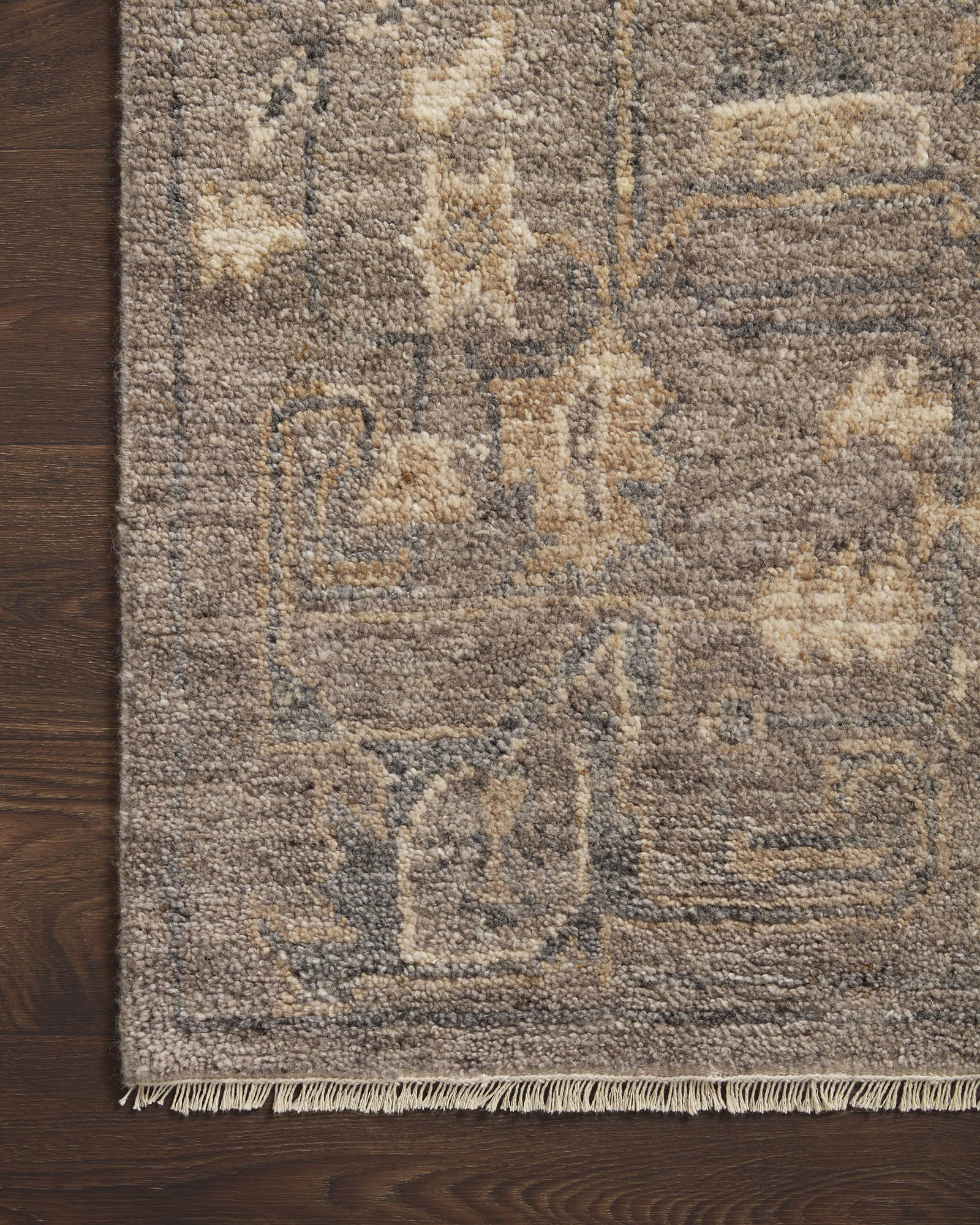 Featuring timeless designs, this collection is hand-knotted in India of 100% wool pile. The tonal collection showcases illustrative marks finished with a subtle fringe.