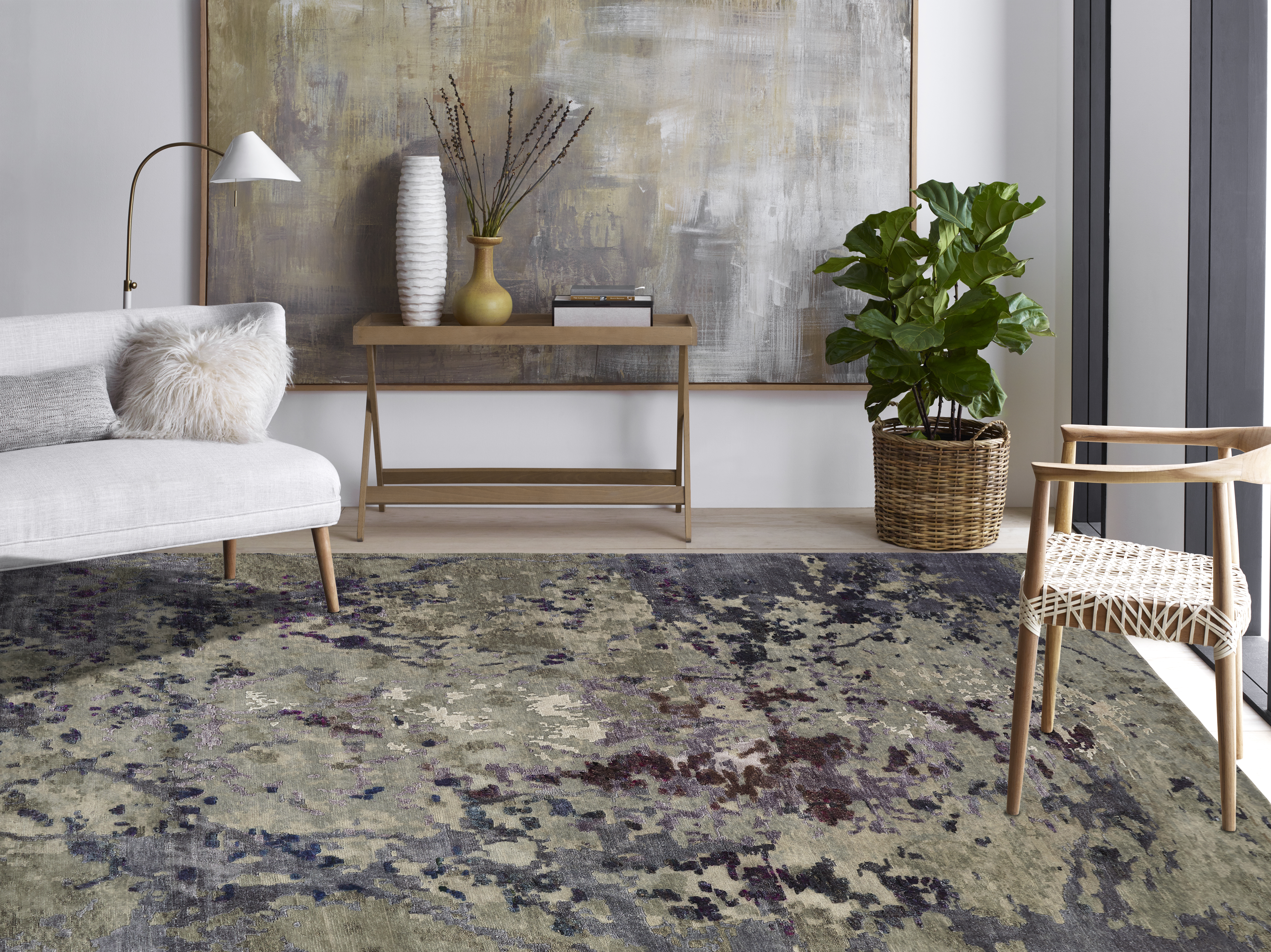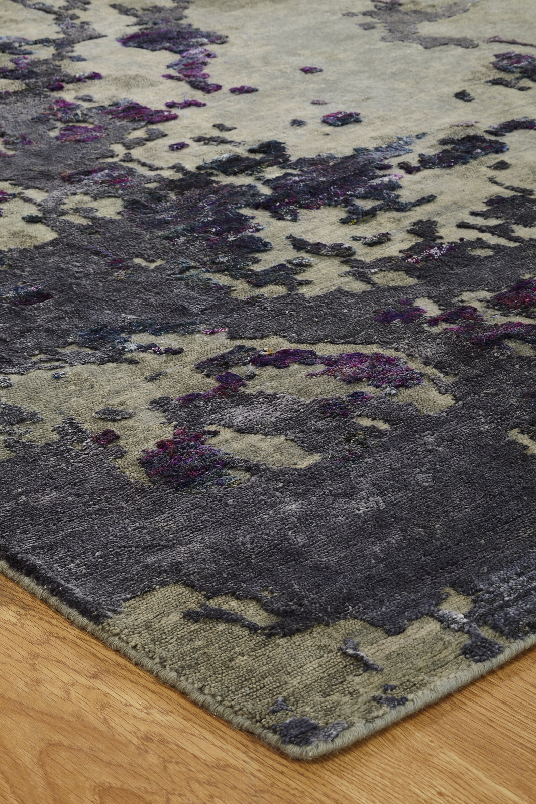 A contemporary loop-and-pile area rug that is hand knotted in a loom weave using premium wool and bamboo silk. Various multi-level motifs provide texture and visual interest to this handsome group of modern designs.