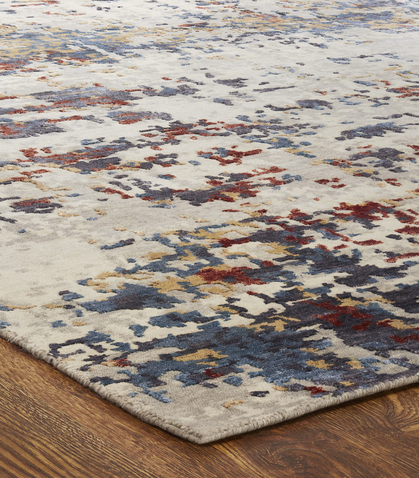 A contemporary loop-and-pile area rug that is hand knotted in a loom weave using premium wool and bamboo silk. Various multi-level motifs provide texture and visual interest to this handsome group of modern designs.