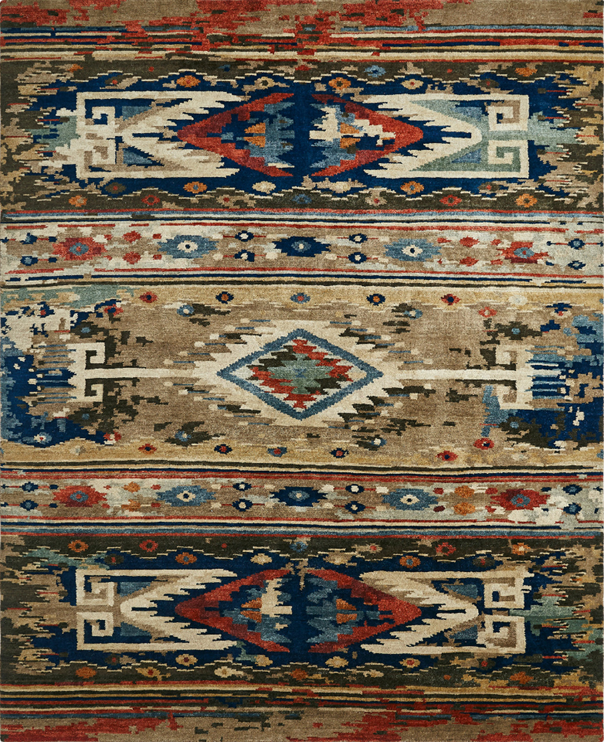 Uniquely casual, these rugs combine tribal and Southwestern patterns in a combination of traditional and fashionable colors and motifs. Stylish with a rugged appeal, each rug is hand-knotted from 100% premium hand-spun wool. A handsome choice!