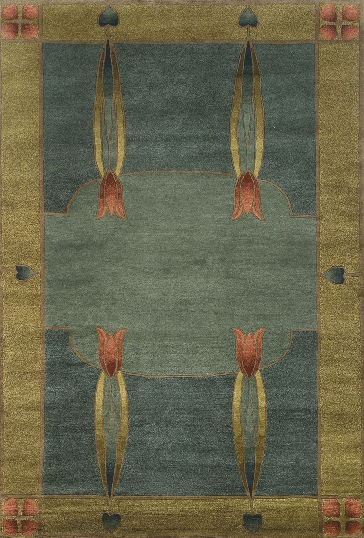Inspired by Dard Hunter's 1906 stained glass windows at the Roycroft Inn in East Aurora, NY, this rug features the tulip, a celebrated design element in the Arts and Crafts movement. Hand-knotted by Nepalese weavers using wool from Himalayan Highland sheep.